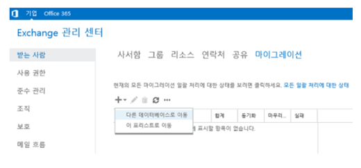 - Get-Mailbox -Database "기본 데이터베이스 명" -Arbitration | New-MoveRequest -TargetDatabase "생성한 데이터베이스 명" 으로 이동