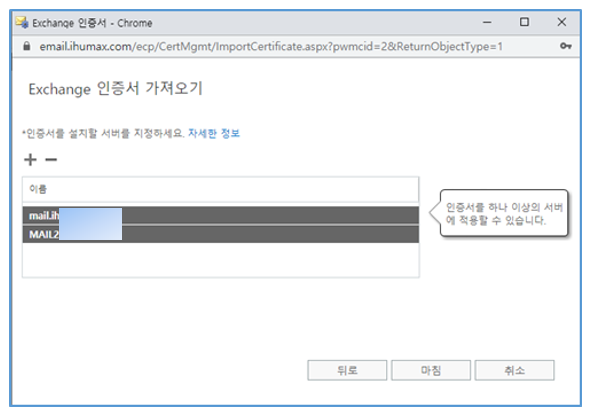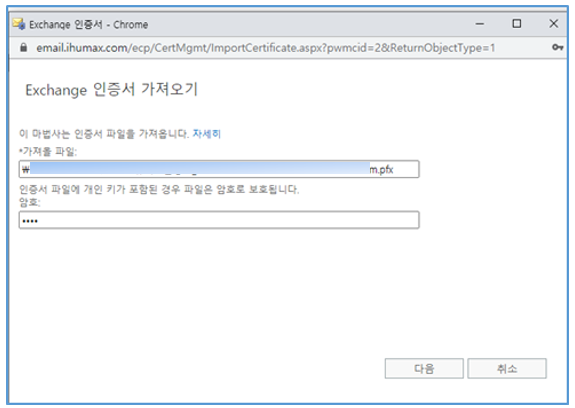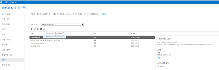 - ECP > 서버 > 인증서 > “Exchange 인증서 가져오기”