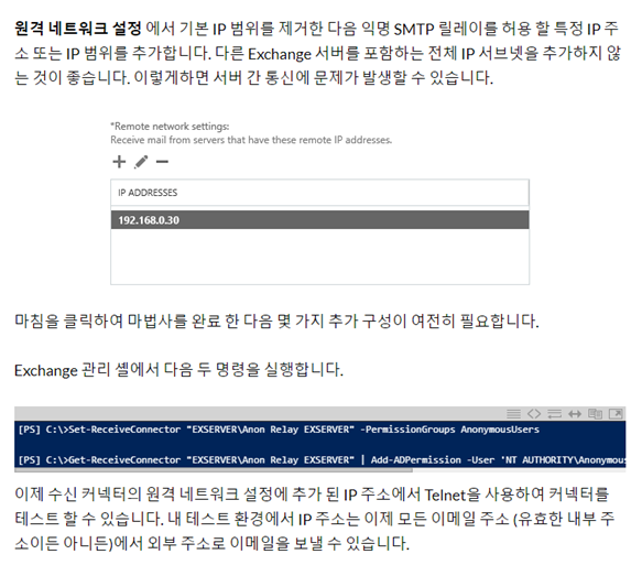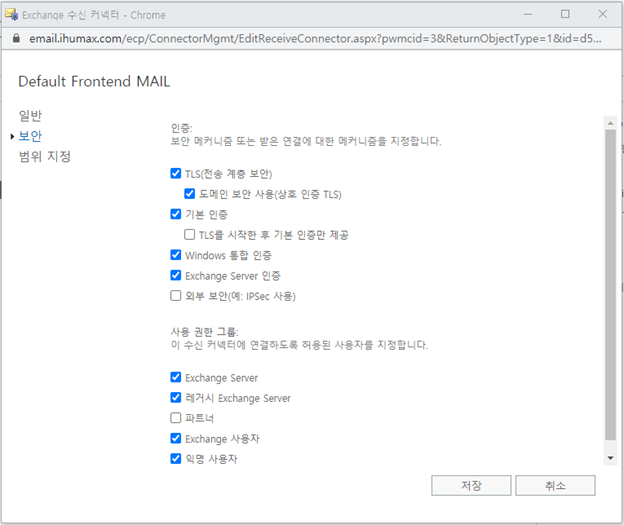 - Exchange 2016 은 기본적으로 내부 릴레이를 허용하지만, 외부 릴레이를 수신하도록 허용하지 않는다. 익명 사용자를 사용 권한 그룹에 설정하여 내 서버의 허용 도메인에 포함되어 있지 않은 외부 도메인에서 메일을 허용할 준비를 하였다.