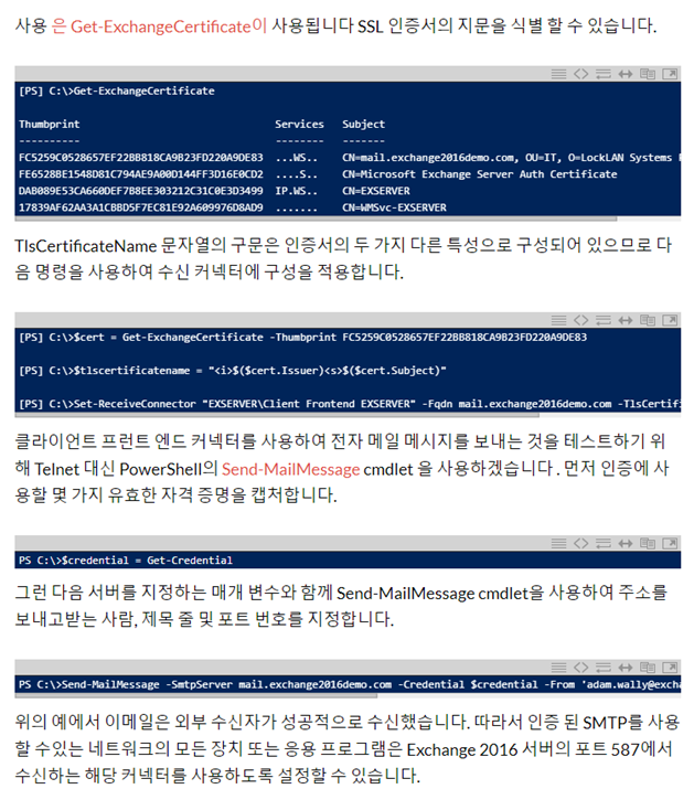 ※ Wildcard 인증서를 적용할 경우, IMAP과 POP은 FQDN이 달라서 바로 적용되지 않는다. Exchange Powershell 을 이용하여 Set-IMAPSettings, Set-POPSettings 를 이용하여 수정하여야 한다.