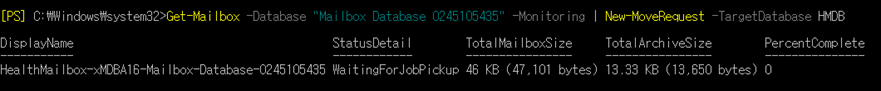 - Get-Mailbox -Database "기본 데이터베이스 명" -Monitoring | New-MoveRequest -TargetDatabase "생성한 데이터베이스 명" 으로 이동