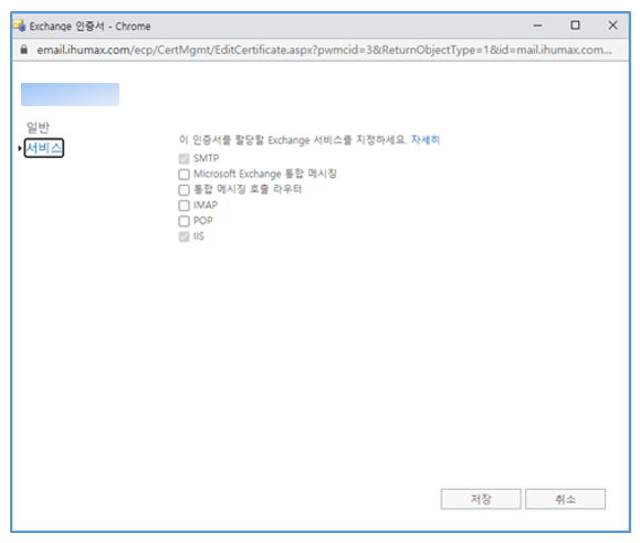 - ‘가져오기’ 가 완료되면 [서비스] 탭에서 인증서에 SMTP와 IIS를 할당한다.