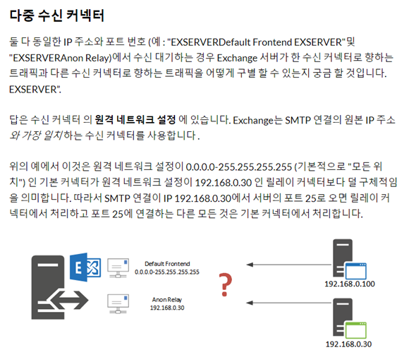 - Exchange 2016 에서는 설치 시 수신커넥터는 생성이 된다. “Default Fronted <Mailbox Server>”로 생성됨.