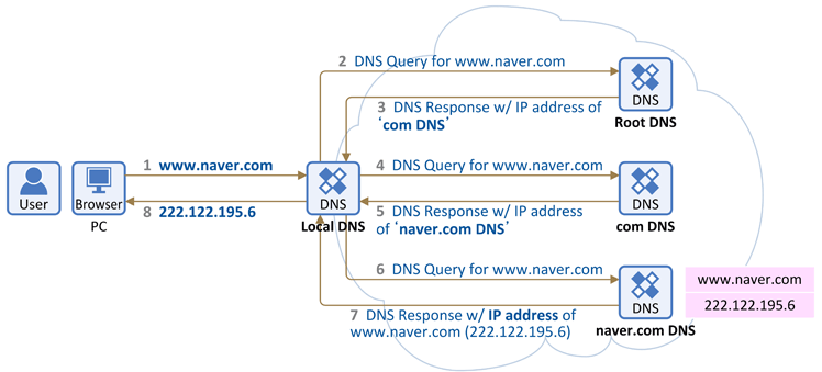 - "naver.com"을 관리하는 DNS Server 에서 "www.naver.com" IP 주소를 Client 에게 알려준다.