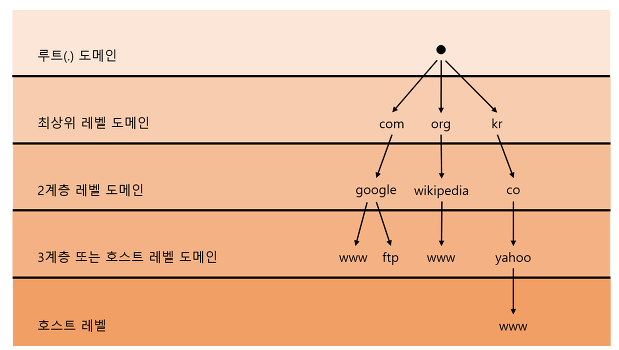 가장 상위 개체는 루트도메인(root, '.')이며, 최상위 레벨은 국가(조직체), 두 번째 레벨은 기관, 최하위 레벨은 서버 이름을 사용한다.