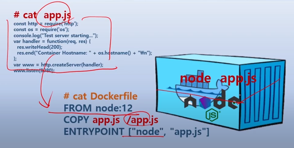 - FROM node:12 // node.js 코드를 해석할 수 있는 환경을 만들기 위해 설치