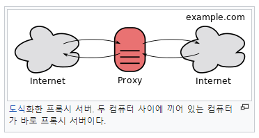 프록시 서버는 Client가 자신을 통해서 다른 Network 서비스에 간접적으로 접속할 수 있게 해주는 컴퓨터 시스템이나 응용 프로그램을 가리킨다. Server와 Client 사이에 중계기로서 대리로 통신을 수행하는 것을 가리켜 '프록시', 그 중계 기능을 하는 것을 '프록시 서버' 라고 한다.