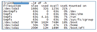 위 서버는 8개의 파티션이 있으며 각각의 파티션은 / , /dev , /dev/shm , /run , /sys/fscgroup , /boot , /home , /boot/efi 에 마운트되어 있다. 또한 디스크는 /dev/sda 라는 이름으로 시스템에 네이밍되어 있다.