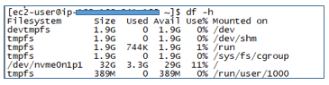 위 서버는 6개의 파티션이 있으며 각각의 파티션은 / , /dev , /dev/shm , /run , /sys/fscgroup , /run/user/1000 에 마운트되어 있다. 또한 디스크는 /dev/nvme0n1p1 라는 이름으로 시스템에 네이밍되어 있다.