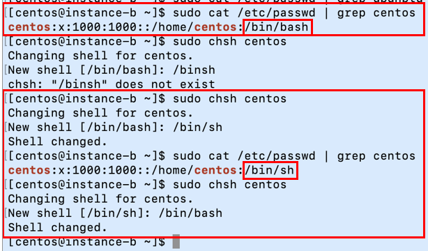 $ cat /etc/passwd //변경된 기본 shell 기록됨.