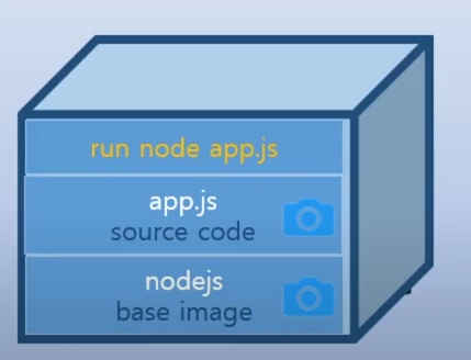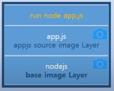- base image Layer : app.js 가 실행되려면 node.js 가 필요하다. 즉 node.js를 먼저 설치하고