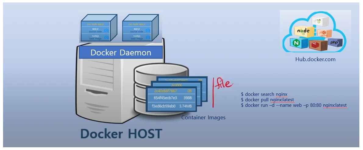 : docker Hub에서 nginx가 있는 지 찾아보아라. dockerd가 docker Hub에 검색을 해서 nginx가 있는 지 확인하여 있으면 List를 출력한다.