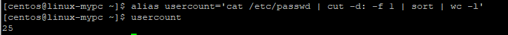 $ alias usercount='cat /etc/passwd | cut -d: -f 1 | sort | wc -l