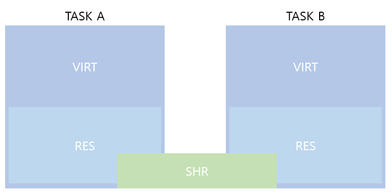 - VIRT - (보통 프로세스라고 부르는) task가 사용하고 있는 virtual memory의 전체 용량.