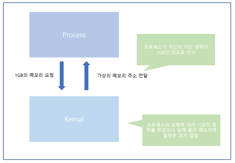 ※커널은 프로세스의 메모리요청에 즉시 할당하지 않고 Memory Commit 과 같은 기술을 써서 요청을 지연시키는 이유